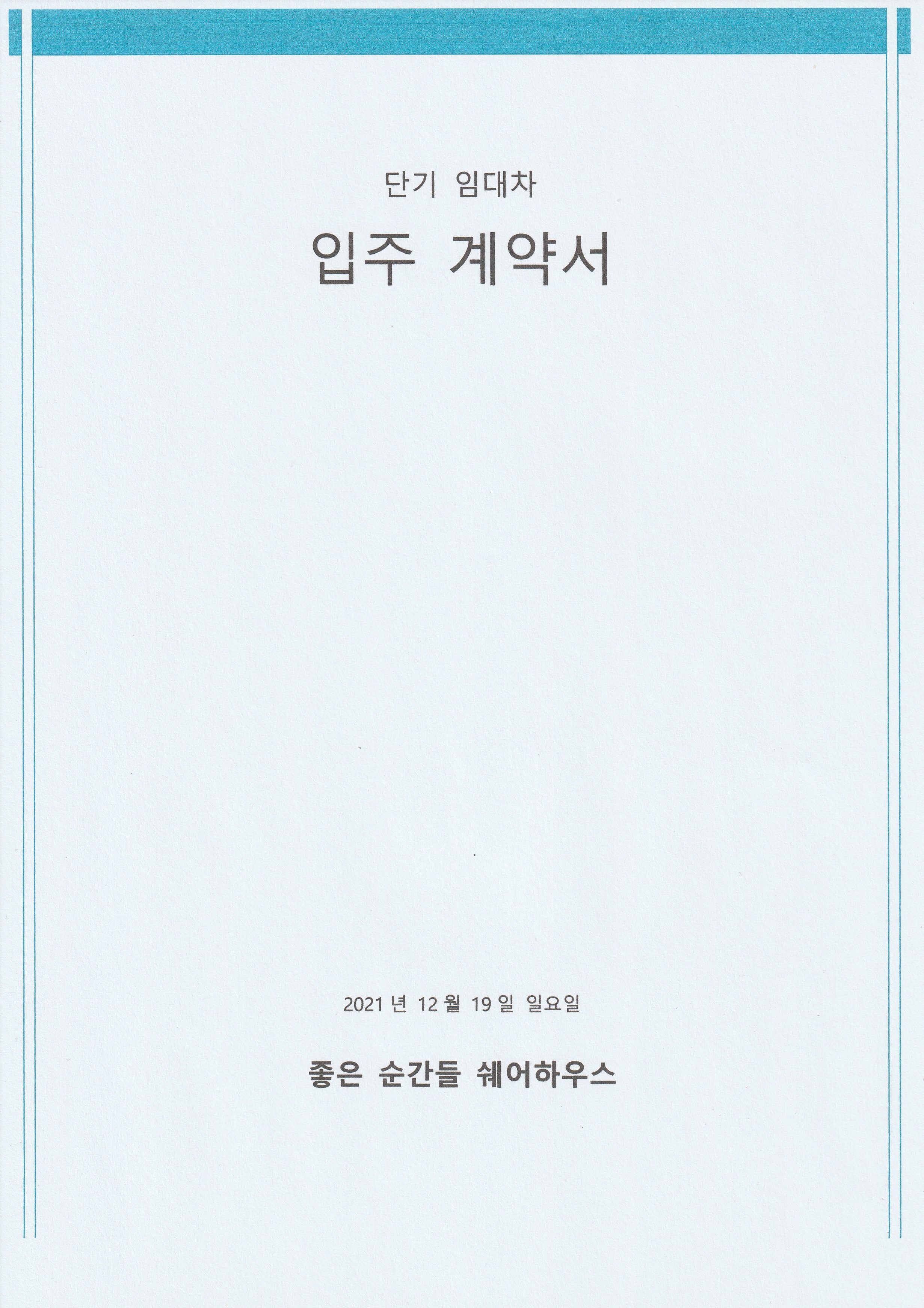 단기임대차계약은 "좋은 순간들 쉐어하우스" 내의 공용부분을 포함하여 일부분을 일시 주거목적으로 사용하는 단기임대차계약의 기본사항을 정하고 거주자 각자의 권리와 의무를 정하여 쉐어하우스내의 기본질서를 유지하여 가능한 한 우리 집처럼 평화롭고 화목한 주거공간을 만들기 위하여 다음과 같이 단기임대차계약을 체결한다.